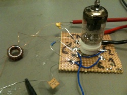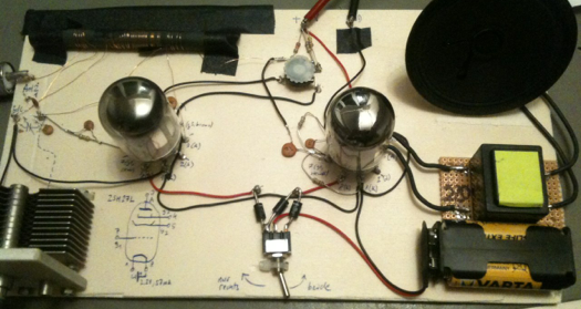 The nice thing about the kit is that they use low plate voltages (9V, 18V) for most experiments in the booklet, so the risk to kill yourself is small. One experiment is a medium-wave radio which I built (see the photo above). I can receive many MW stations in the evening with this radio.